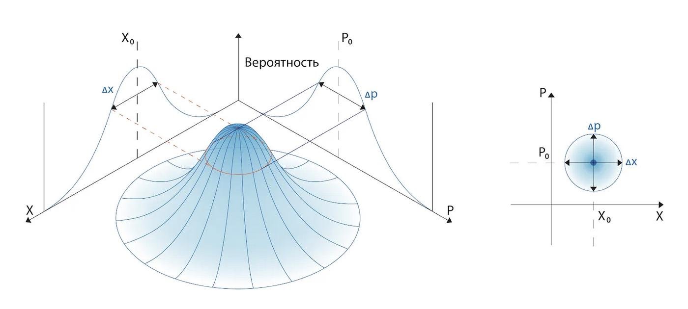 Это соотношение можно увидеть и иначе: если построить вероятность получить результат измерения, у нас получится такой вот красивый колокол, проекции которого на оси координаты и импульса дают гауссовское (нормальное) распределение. А если посмотреть на ту же картинку сверху, мы получим красивый кружок, определяющий неопределенность. Запомните его, он нам пригодится дальше.