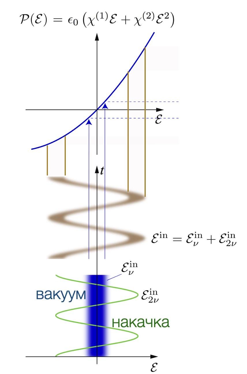 Первый важный момент: в нелинейной оптике (и уравнениях Максвелла, кстати) есть величина — диэлектрическая поляризация. В применении к кристаллу, она описывает преобразование электрического поля на выходе, если не вдаваться в подробности. Вот мы напишем