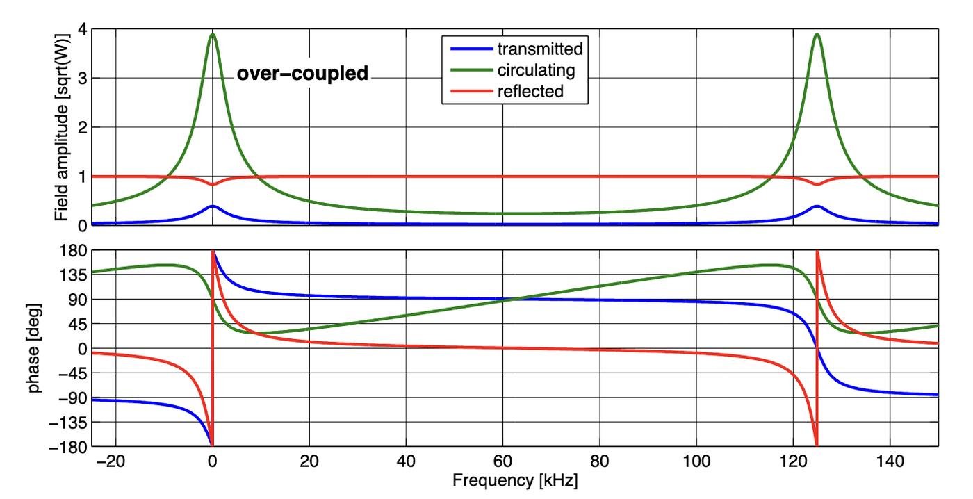 Тут показан пример: в резонансе (частота = 0) фаза отраженного света =180 градусов, а вдалеке от резонанса — 0. Между ними фаза меняется плавно. Это и используется в частотно-зависимом сжатии: резонатор выбирается так, чтобы фаза плавно вращала сжатие от амплитудной к фазовой квадратуре. Там много деталей, но мы дальше не пойдем.