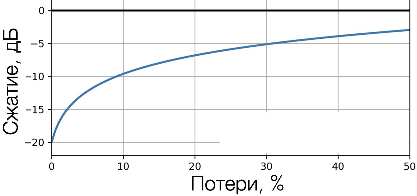Чтоб было понятно: 20 дБ — сжатие в 10 раз по амплитуде, 10дБ — в 3.3 раза, 6 дБ — 2 раза. Для большинства платформ, где производится сжатие, 6 дБ — уже большой успех.