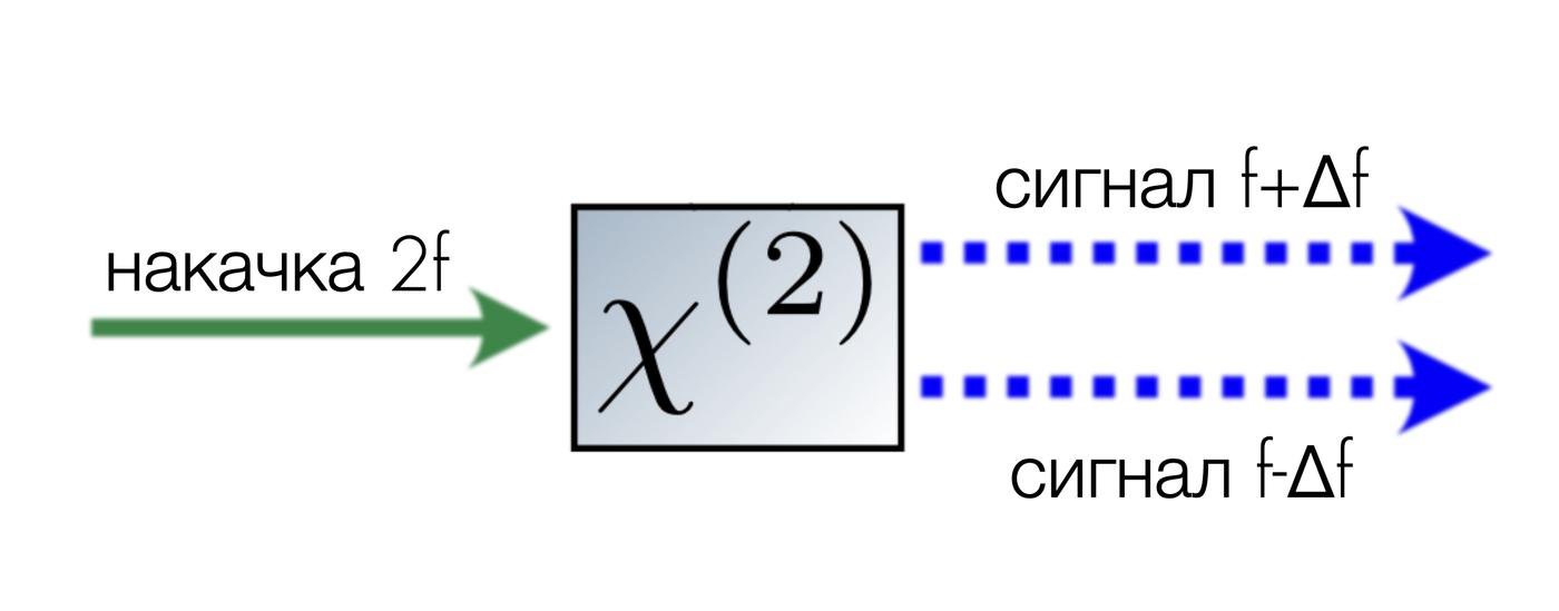 Вообще способов много, и я дальше в статье расскажу подробнее про них. Но для начала мы рассмотрим конкретный процесс: нелинейный кристалл. Мы берем один фотон накачки с частотой 2f и превращаем его в два фотона сигнала, каждый с частотой f±Δf — так, чтобы их суммарная энергия (частота) складывалась в 2f.