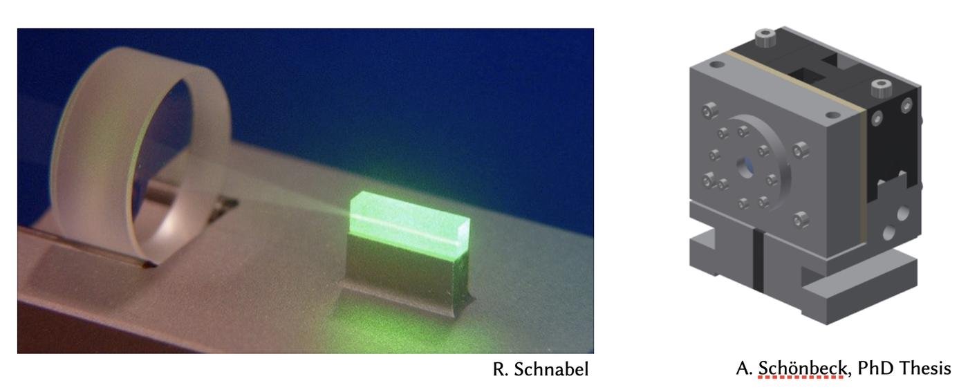 Для этого мы используем оптические резонаторы (обычно они еще и резонируют для сжатого вакуума, но это детали). Ставим нелинейный кристалл между двумя зеркальцами и радуемся резонансу света накачки. Какой-то сотни ватт хватит для отличного сжатия!