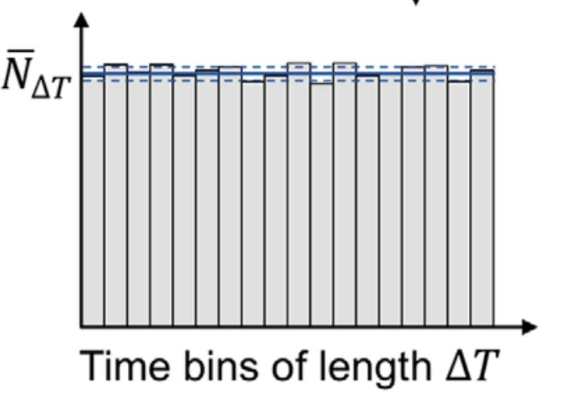 Теперь давайте представим, что у нас есть лазер — поток фотонов и мы измеряем его на фотодетекторе. Детектор измеряет бинами ΔT, и в каждом из них в среднем — N фотонов. Когда лазер не сжат, этот поток фотонов абсолютно случаен, так что иногда прилетает больше фотонов, а иногда — меньше, с некоторой дисперсией (неопределенностью) ΔN = √N