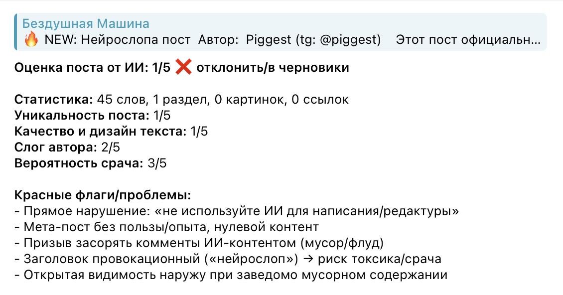 Формально он соответствует правилам платформы, однако его структура, лексика и общая подача выглядят чрезмерно шаблонными и лишёнными индивидуальности, что может указывать на автоматическую генерацию. Подобный контент потенциально снижает общее качество обсуждений и вводит пользователей в заблуждение относительно подлинности мнений.