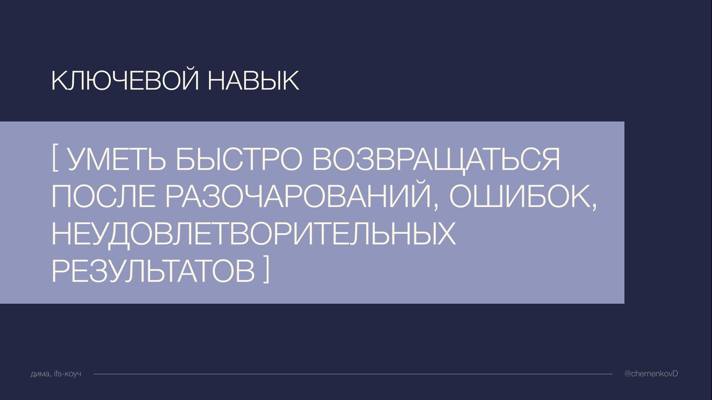 А ключевой навык, который можно освоить, это уметь быстро возвращаться после разочарований, ошибок, неудовлетворительных результатов.