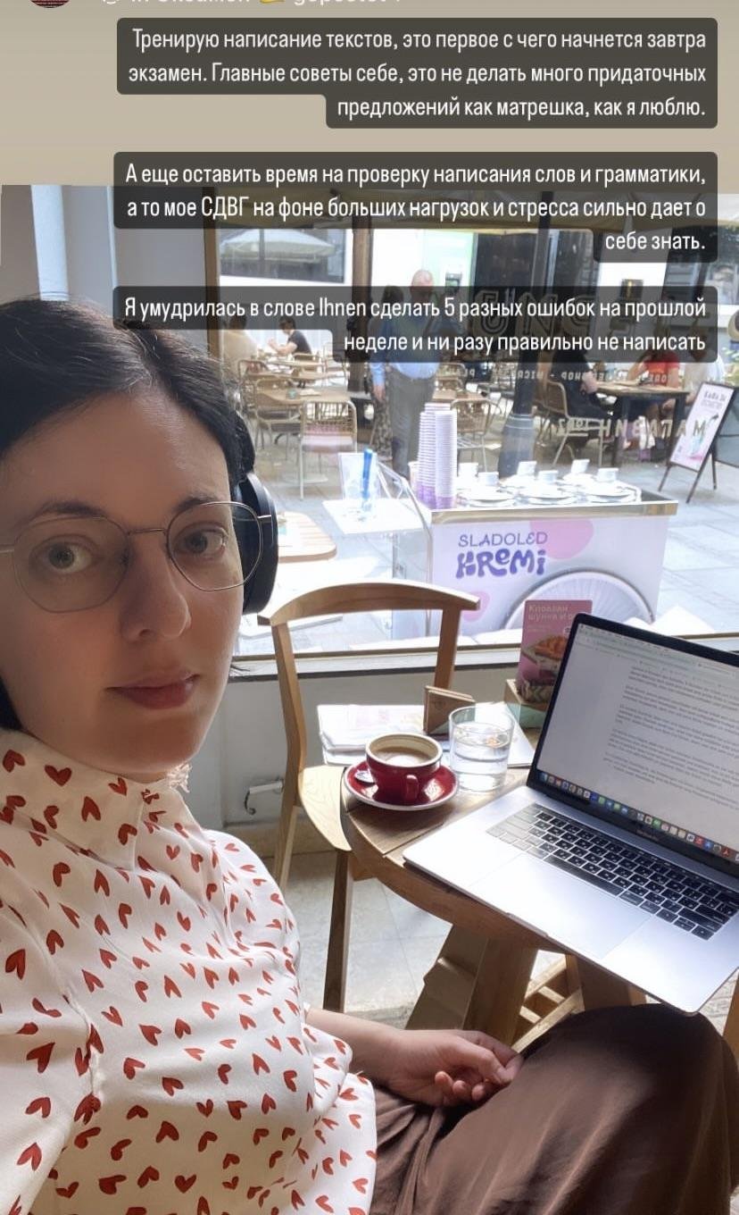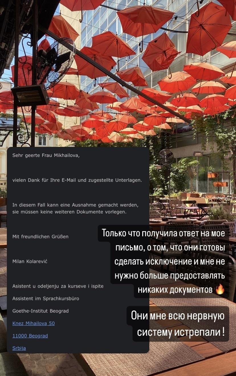 Параллельно меня еще заставили сдавать экзамен по-немецкому, на что я не рассчитывала и там же в горах я судорожно искала слот на сдачу и в Тбилиси тогда его не было и мне пришлось лететь сдавать экзамен в Сербию. У меня был мега короткий срок на подготовку и тогда пришлось брать уроки немецкого 5 раз в неделю и делать каждый раз домашку по 30 страниц.