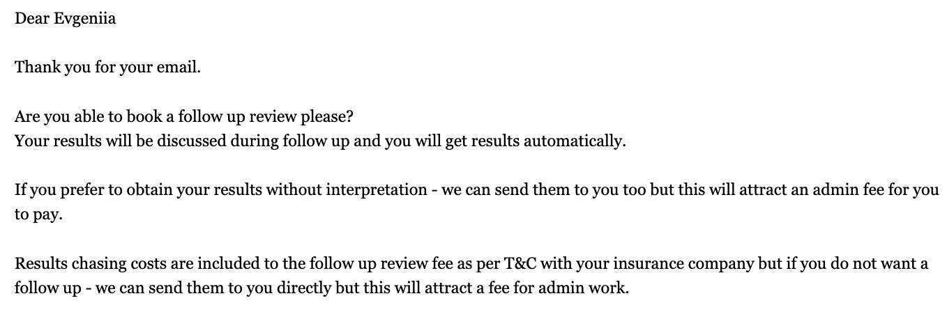 Другой вопиющий случай был такой: я запросила у клиники результаты анализов (один из которых стоил страховой 1500 фунтов), на что получила вот такое письмо: