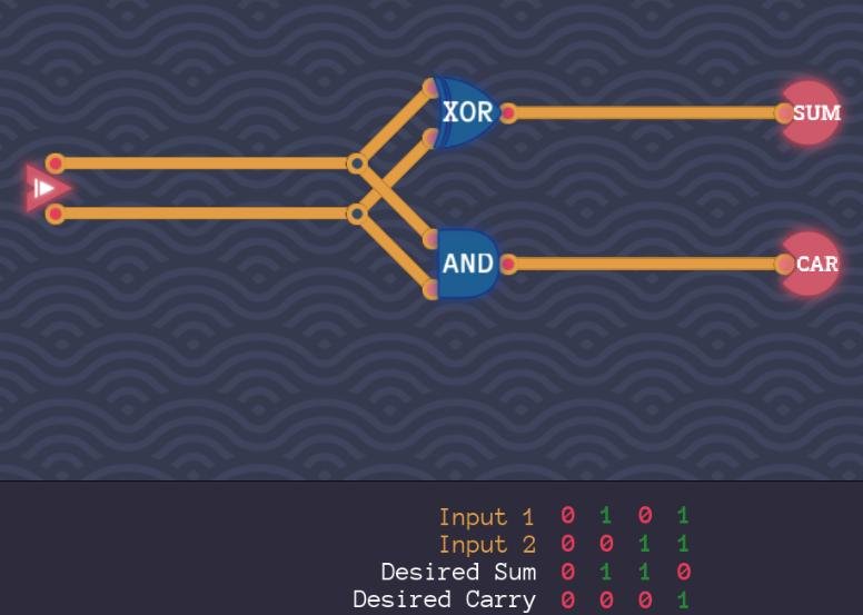 Эта схема имеет 2 входа(А и B) и 2 выхода Sum(результат разряда) и так же Carry-out(перенос, та самая единица при 1+1=10).