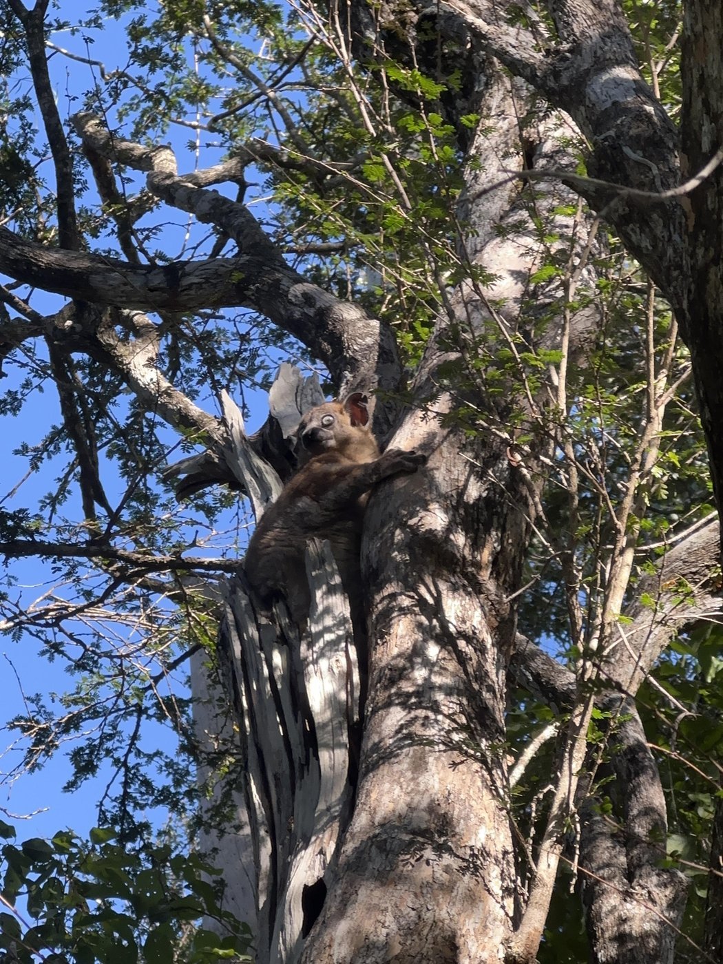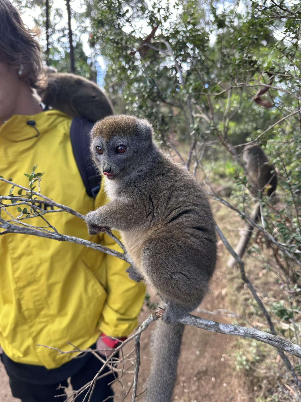 На этот раз нашей основной задачей было, по указанию гида, стоять и смотреть на палку в кустах, в надежде, что туда придет лемур. Сначала мы смотрели на палку в одном месте, затем в другом и еще в нескольких других местах. Спустя полчаса этого бесполезного занятия мы просто пошли вдоль дороги. По пути мы нашли уйму разных хамелеонов, но лемуров не увидели. И только на обратном пути нам удалось заметить парочку. Один из них даже спустился достаточно низко, чтобы его можно было сфотографировать.