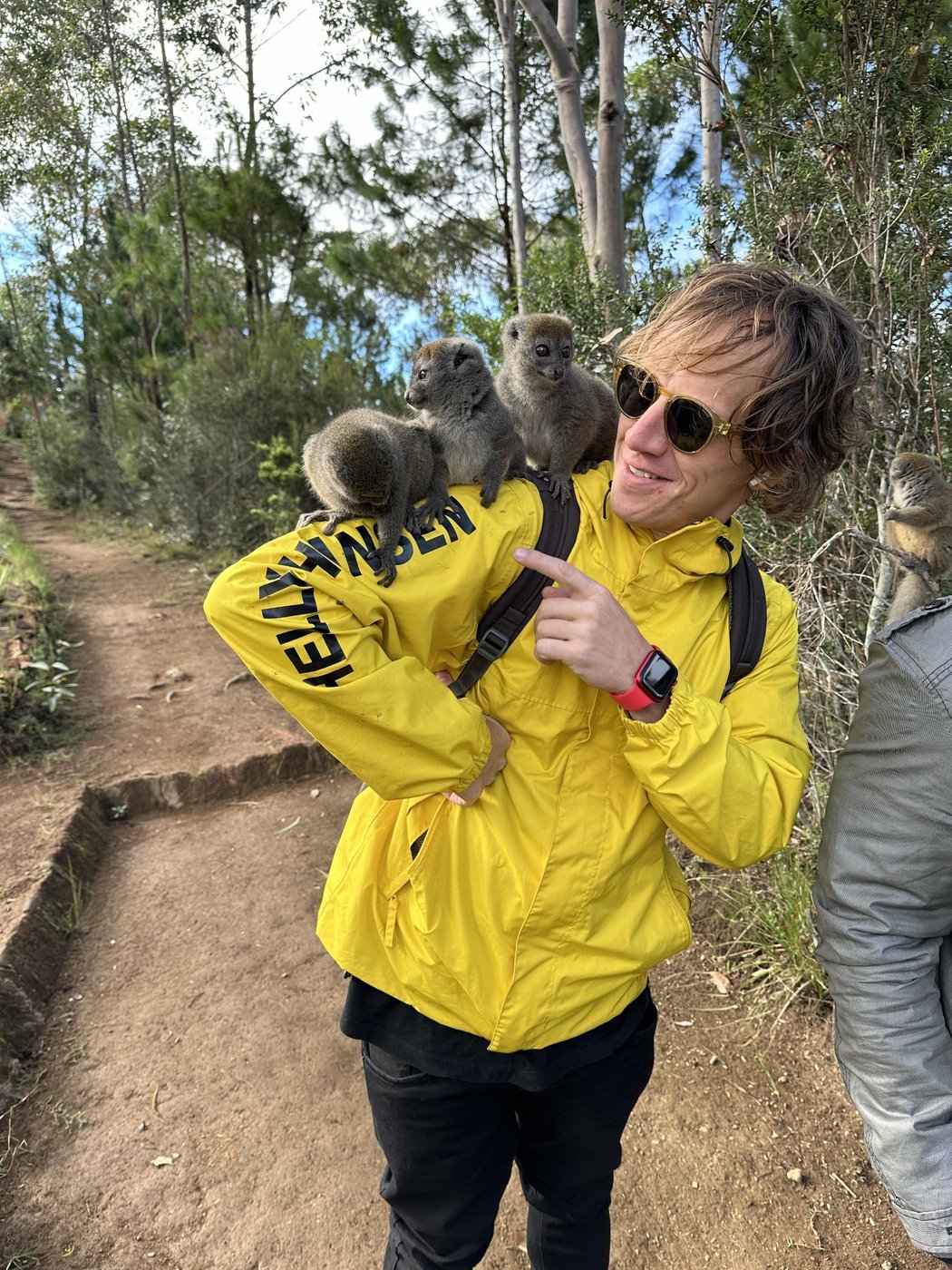 Буквально через несколько метров, достав банан из пакета, он привлекает целую кучу бамбуковых лемуров.