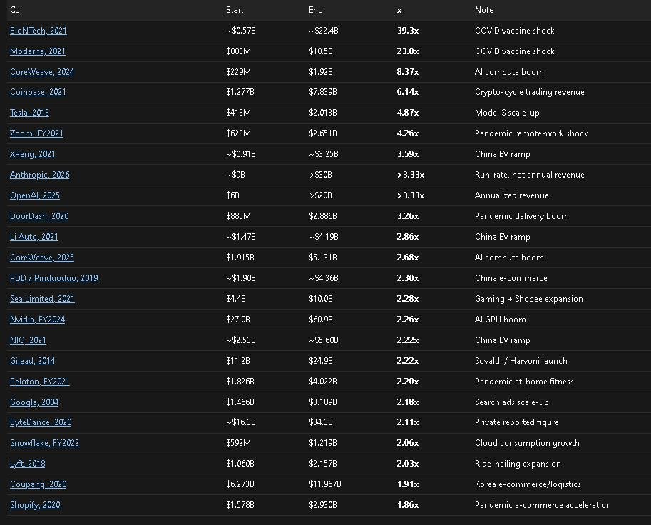 Даже когда складывались уникальные условия в прошлом, таких цифр не было ни у кого (с натяжкой, поясню ниже). Например, Zoom в пандемию, Google в момент их выхода на IPO, Coinbase когда они заработали на комиссиях на хайпе крипты. Это компании, которые в 5-10 раз меньше Anthropic, которые находились в особой ситуации и все равно росли медленнее.