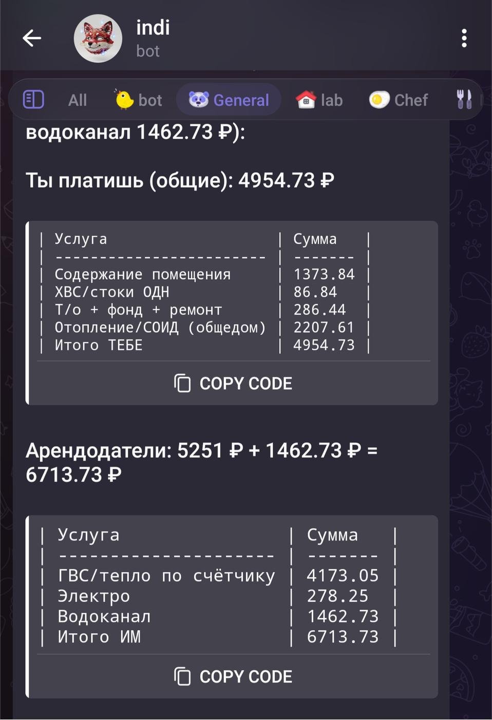 Теперь я просто перенаправляю квитанцию от ЖКХ боту, и он присылает готовый расчёт с разбивкой: что плачу я, что — арендаторы. Больше не нужно ничего считать руками