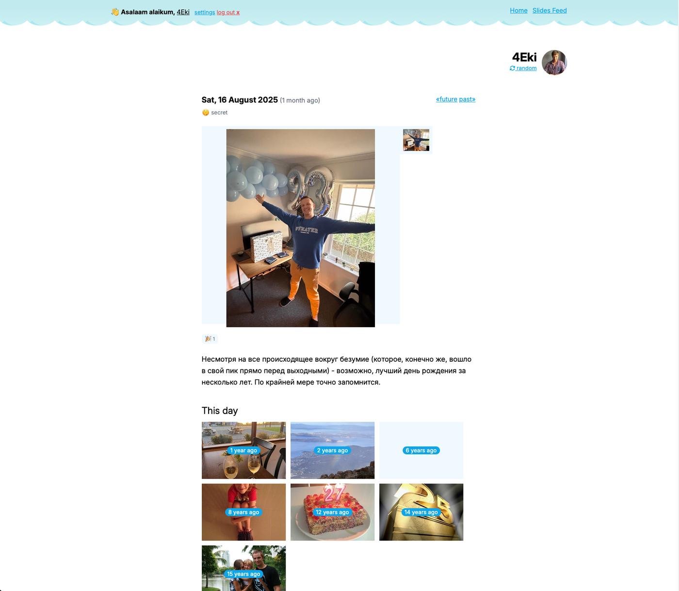 Привет, чят 🖖 Меня зовут Саша и еще в 2010 я сделал сервис-дневник, который помогает бороться с ощущением «дня сурка». Каждый день вы сохраняете короткую запись с фото, а потом сервис напоминает, что происходило «в этот день год назад». Так становится заметно, что дни на самом деле разные, и даже мелкие события складываются в историю. Через какие реинкарнации сам сервис прошле за эти год и чем в итоге стал я бы и хотел здесь рассказать...