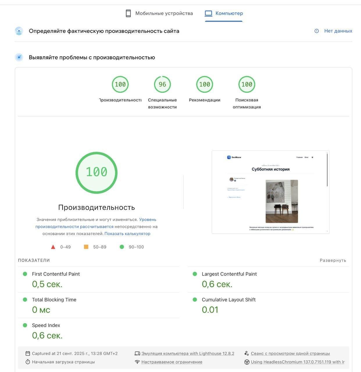 НАДО БЫ: убрать тяжёлые шрифты, ленивую загрузку картинок, проверить Lighthouse Score (PageSpeed ≥ 90). Мы замарочились и забабахали перфектную On-Page оптимизацию, чтобы поисковики кушали за обе щеки. А после поисковиков и ИИ не брезгают (есть нюансы).