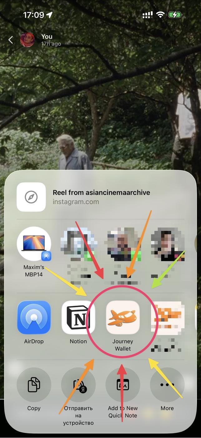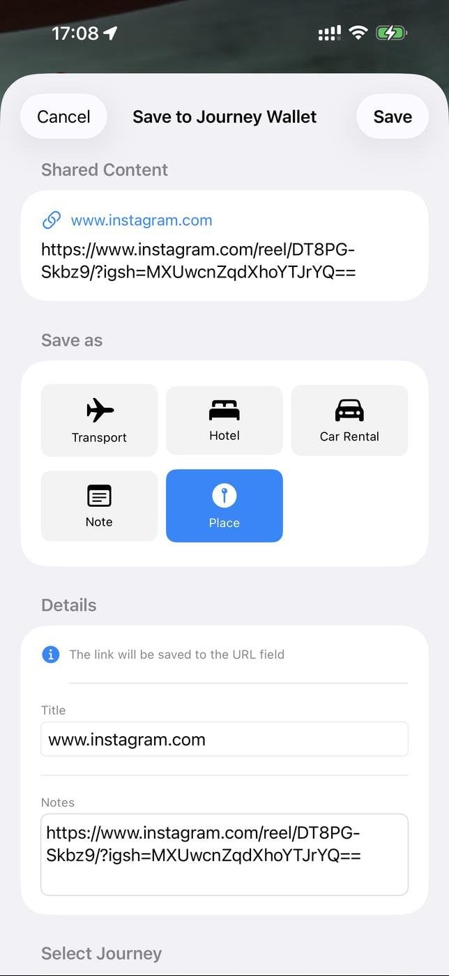 Просто нажмите на кнопку Share и выберите в контекстном меню приложение Journey Wallet - и приложение предложит вам сохранить ее как любой артефакт путешествия: бронь, заметка, место для посещения, etc