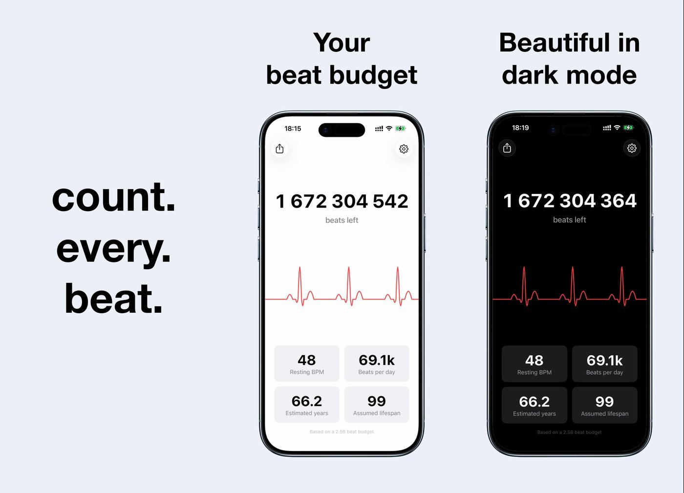 Billion Beats – это одно из таких упражнений. Приложение подключается к Apple Health, читает твой пульс и показывает простую, но пробирающую до мурашек цифру: сколько ударов сердца тебе осталось из твоего «бюджета» в 2.5 миллиарда.