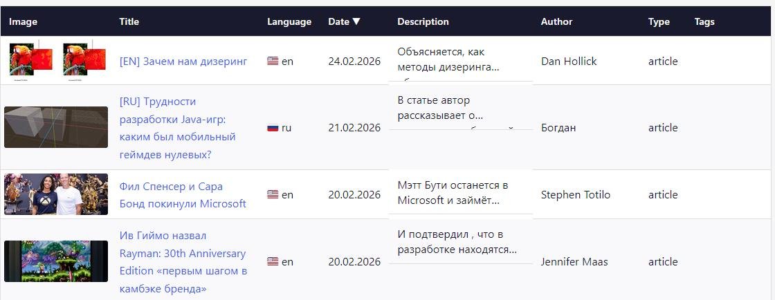 4. **Collect digest basic info**: Inside the `<h1>` header you can grab info. Header format: `Недельный геймдев: #<number> — <day> <month>, <year>`.
