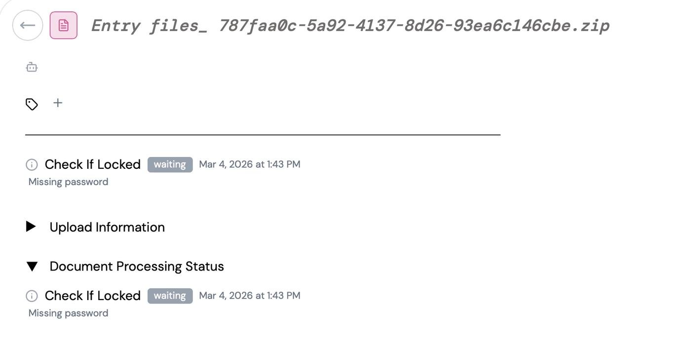 Загрузил ZIP архив (без пароля) с одной PDF'кой, залипло на "Check If Locked -- Missing password". Загрузил PDF'ку из него отдельно – все обработалось корректно.