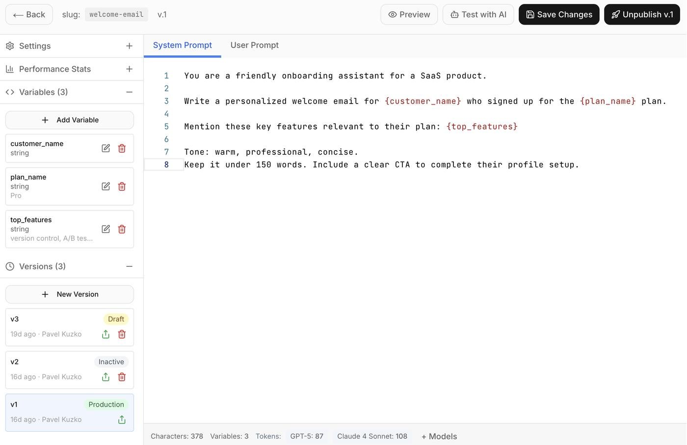Первый прототип собрал за пару недель: дашборд для промптов + API для их получения. Минимум, чтобы проверить — буду ли я сам этим пользоваться. Пользовался. Ок, значит можно копать дальше.