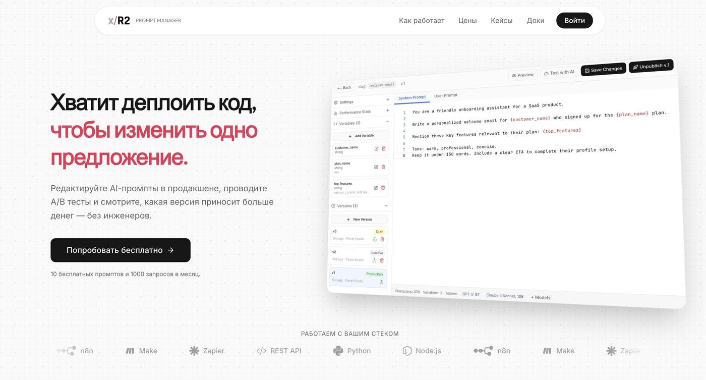 Сейчас делаю другое. xR2 — это платформа для управления промптами. Если коротко: вместо того чтобы хардкодить промпты в коде или в n8n-сценариях, вы храните их в одном месте и дёргаете по API.