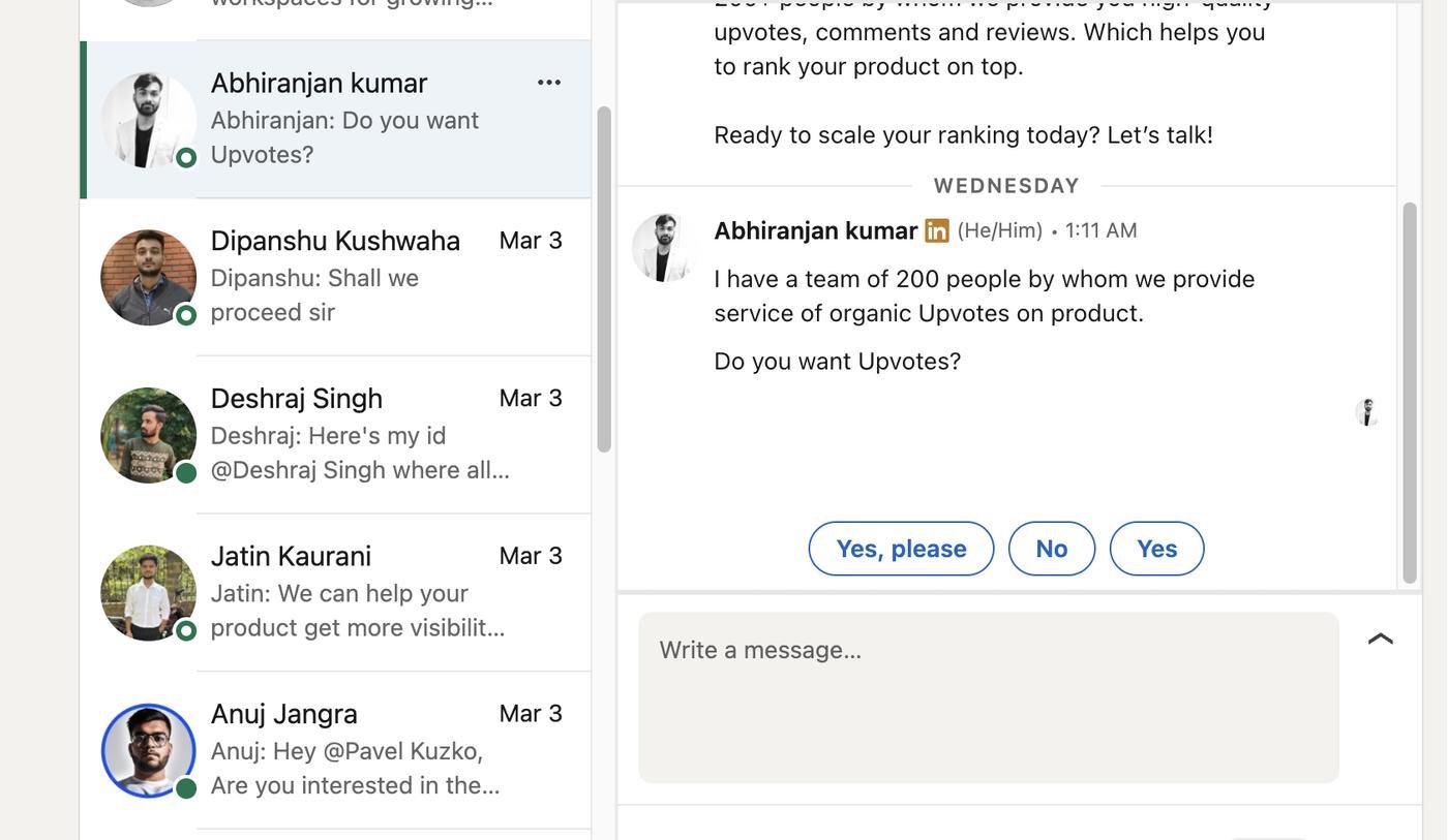 LinkedIn оказался самым живым каналом. Два поста: первый (личная история) набрал 1252 impressions и 11 лайков. Второй (просьба поддержать на PH) — 263 impressions. Ещё и индусы набежали в личку с предложениями "200 upvotes за $50, all organic not bots".