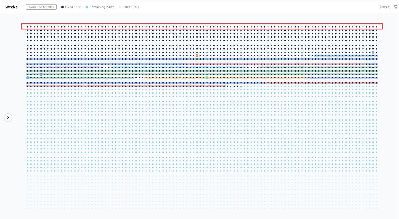 Меня зовут Богдан Нетеребский, я разработчик, живу в Белграде. Проект называется Weeks — инструмент для визуализации жизни. По сути, это сетка: каждая клеточка — одна неделя твоей жизни. Прожитые, оставшиеся, бонусные сверху — всё в одном экране. Изначальная концепция была построена вокруг недель (отсюда и нэйминг, и домен). Но, как оказалось, и с месяцами тоже неплохо, а местами даже понятнее.