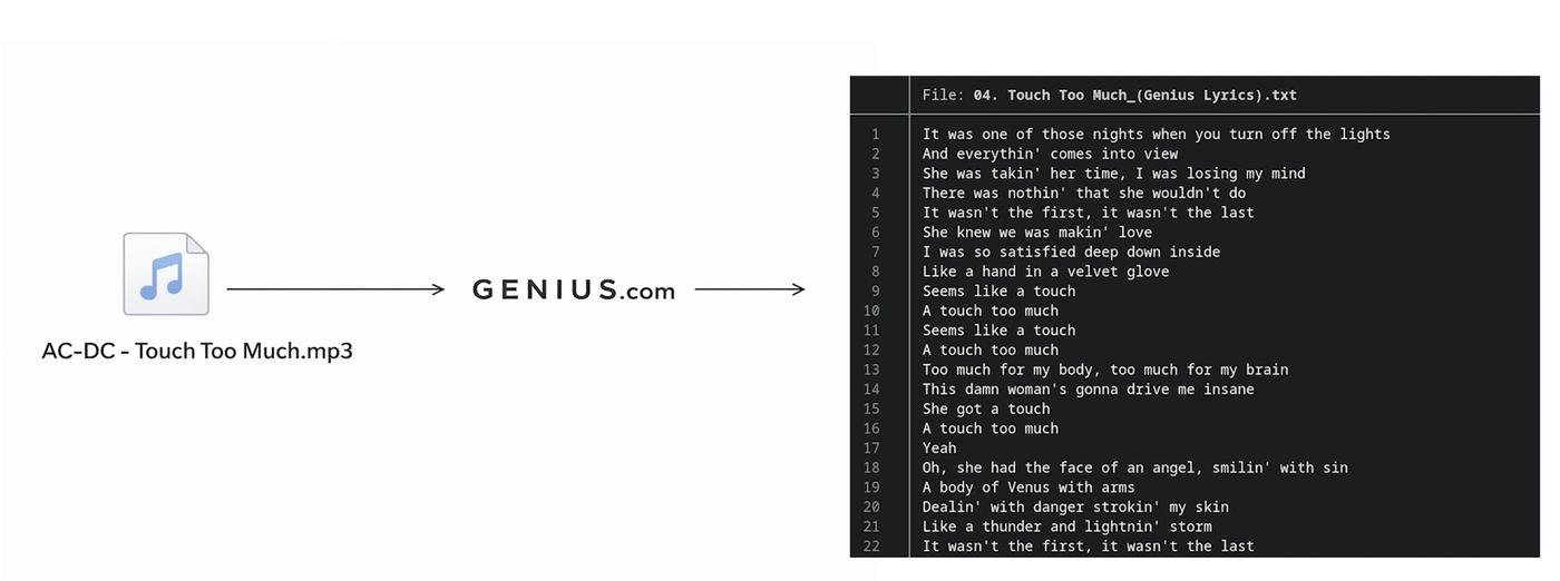 Я выбрал сайт Genius.com и питон-библиотеку для скачки текста оттуда через API: https://github.com/johnwmillr/LyricsGenius. Единственная заморочка - надо зарегаться и выпустить бесплатный API Access Token и положить его в .env (в ридми моего проекта это есть).