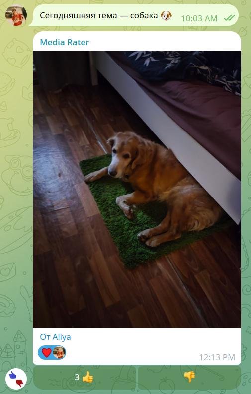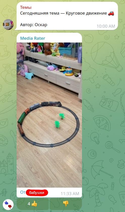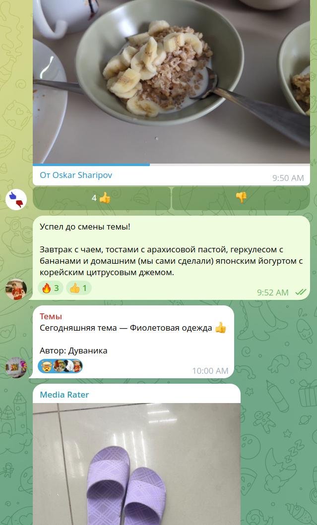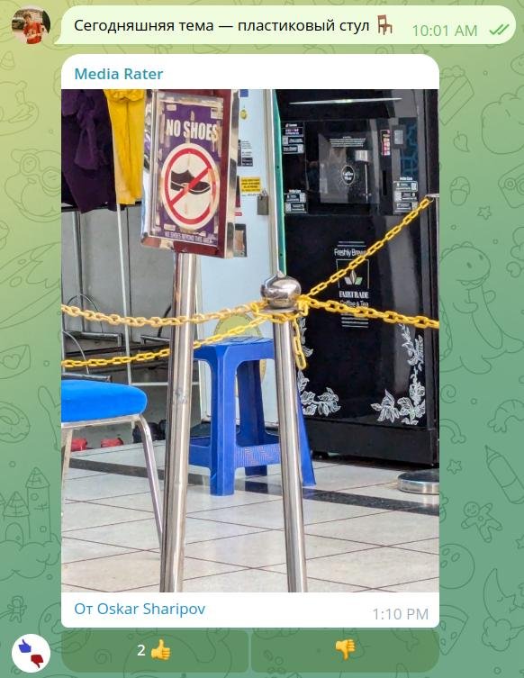 Первые 40 тем я отправлял вручную. C помощью отложенных сообщений и разметил темы по дням и сразу же добавил в чат Media Rater. Это бот, которым пользуются в чате мемов, чтобы мериться размером своего баяна. Для нашего чата с темами бот добавлял кнопки 👍 и 👎 к каждой фотке и показывал топ отправок за последние дни.