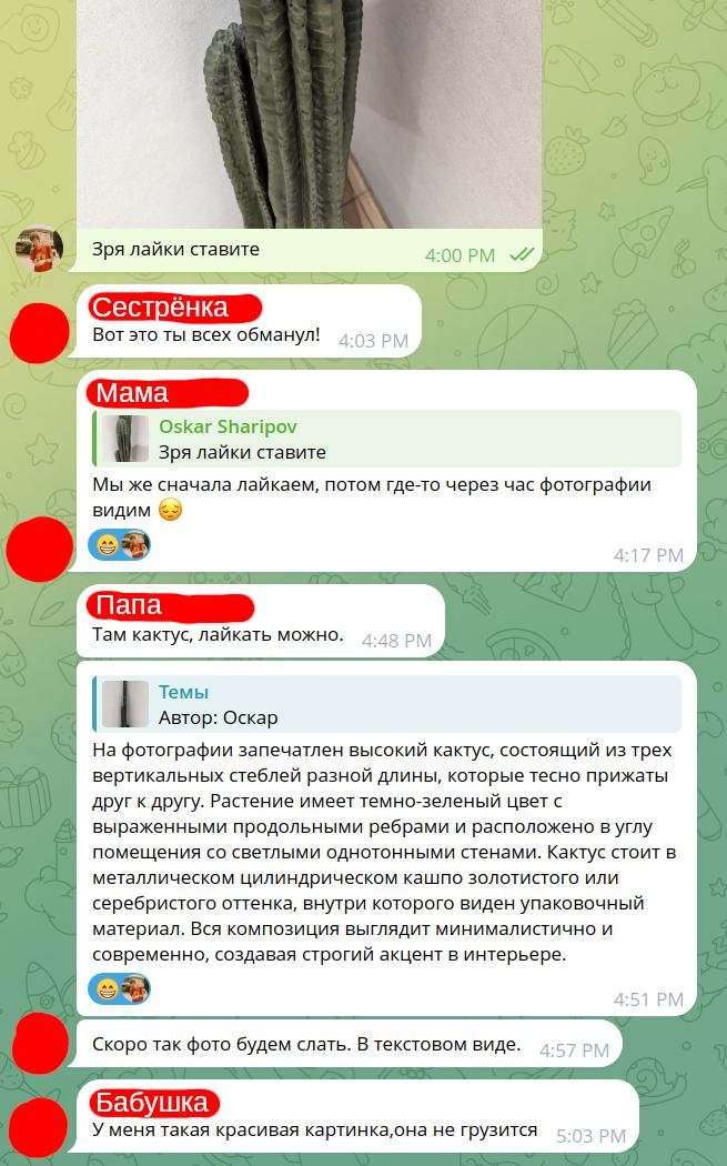 Да чёрт подери этот Роскомнадзор! Как только в России начали блокировать Телеграм, в нашем семейном чате все затормозило. Я и девушка спокойной отправляли новые фотки, а родные страдали. Особенно бабушки. Здесь я заслал кактус без иголок на тему «Игла 🪡» и узнал, что в тот день почти никто этот кактус не видел: