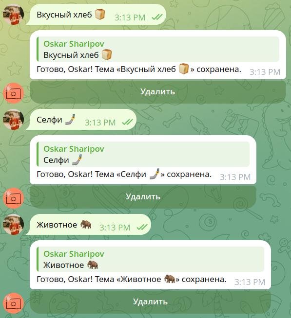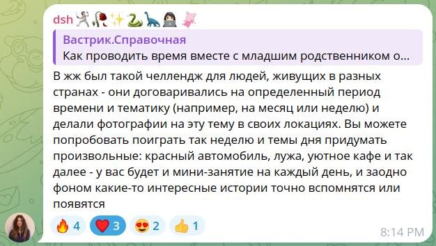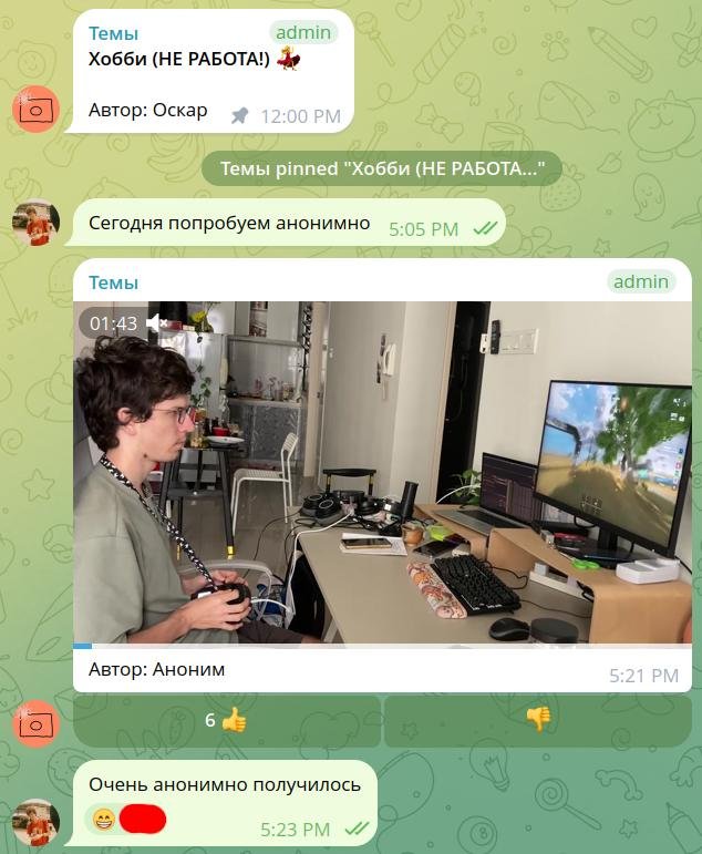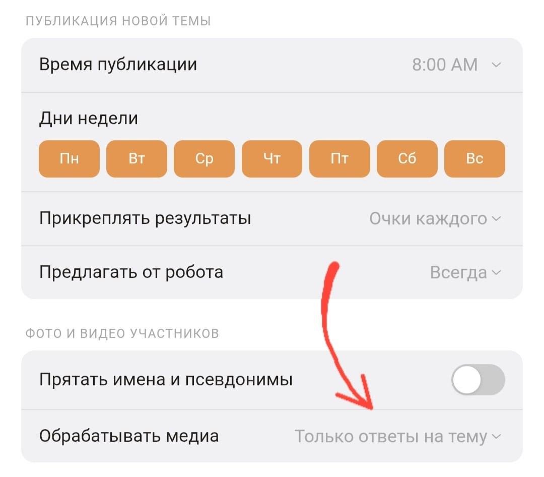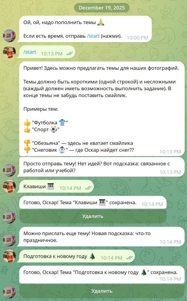В настройках вы можете установить отправку только раз в неделю или в какие-то особые дни недели, чтобы не захламлять остальные дни. Чтобы попасть в атмосферу чата, вы можете отключить темы от робота и просить всех участников предлагать свои. Например, в «Трэвеле» участники могли бы предлагать «Огни ночного города 🏙» и «Штамп в паспорте 🛂», а в «Сексе»... Ух! Не знаю, что там у вас происходит вообще??