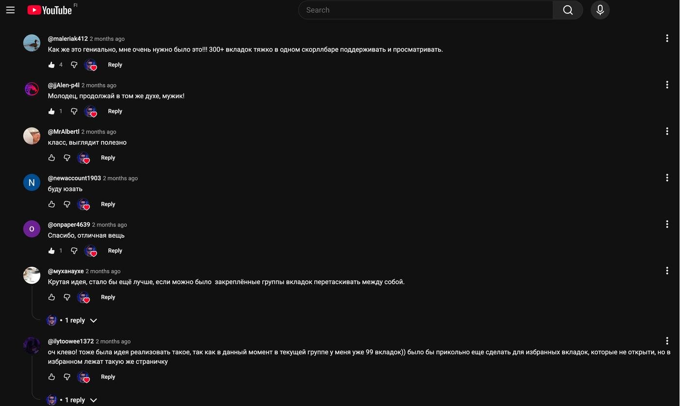 Единственный баг, который мне ужасно не понравился - при закрытии одной вкладки в группе - группа улетает куда-то в другое место и приходится ее искать глазами, закрывать еще одну вкладку, опять искать - в общем утомительно