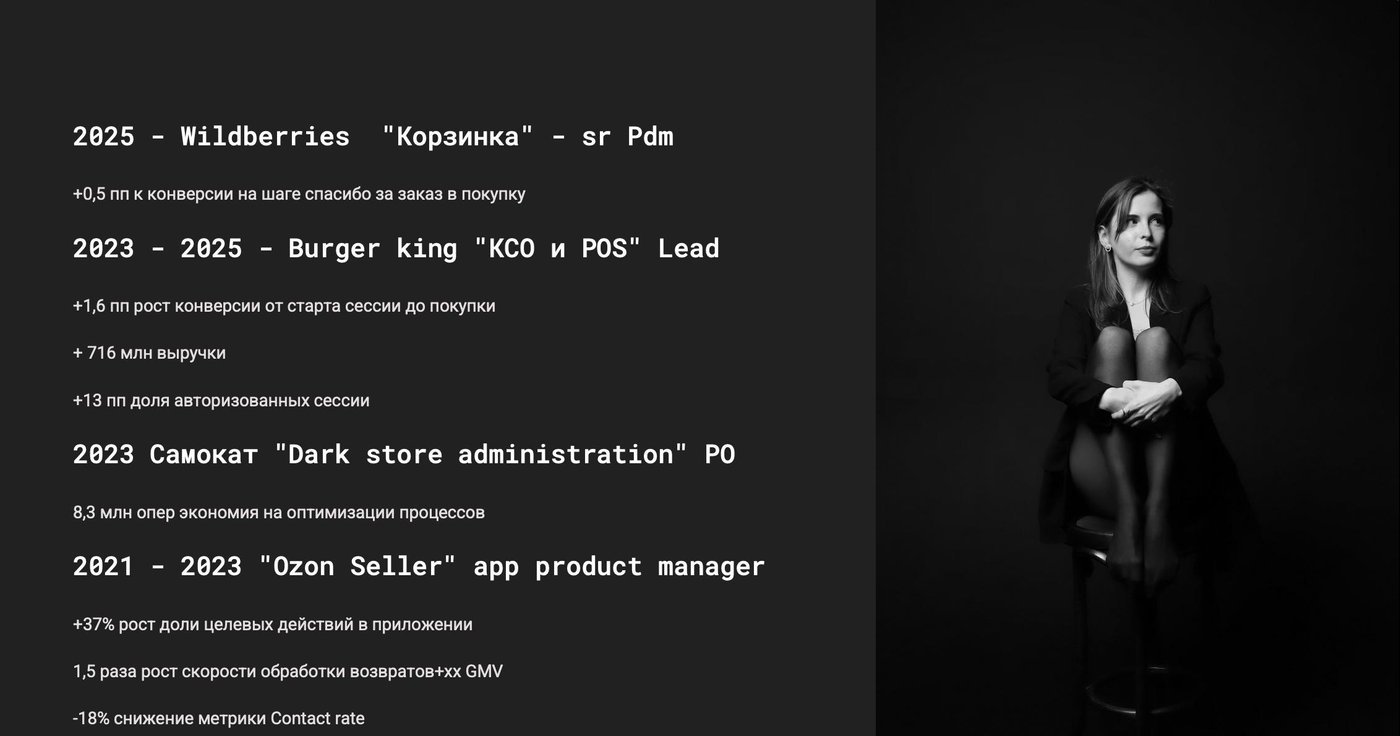 Я продакт-менеджер с 6+ годами опыта в ИТ-продуктах: финтех, медиа, B2B и B2C. Работала в Сбере, Т-Банке, MPSTATS, Rambler&Co - запускала и развивала продукты, интерфейсы и партнёрские интеграции, много работала с неочевидными пользовательскими болями и сложными ограничениями.