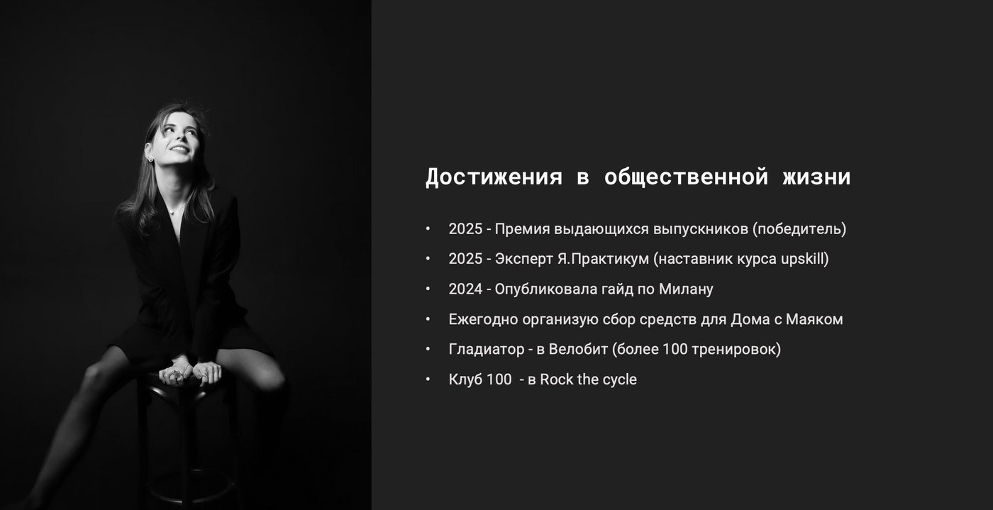 Для меня важно, чтобы дизайн был не только про бизнес, но и про то, как он приносит пользу людям. Мне нравится работать над социально значимыми проектами, и я также занимаюсь волонтерством — это помогает мне увидеть, как даже небольшие шаги могут сделать мир вокруг нас лучше.