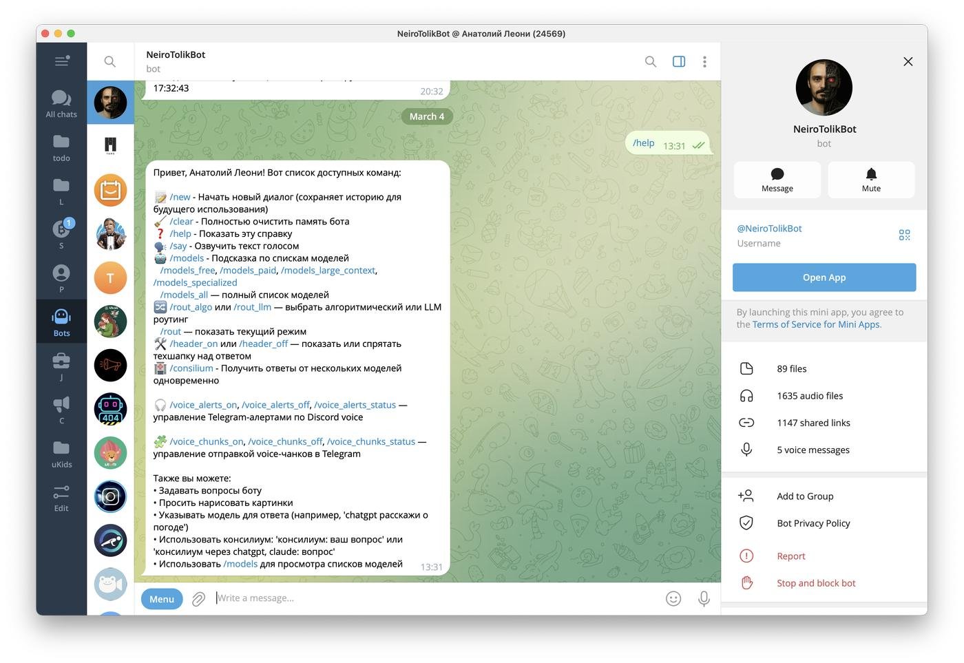Что в итоге с ним стало: Сделал, но закопался с памятью и наваливанием полезностей: уведомление в телегу о входе в дискорд (работает), возможность задать вопрос сразу нескольким моделям (работает), распознавание голосовух (сломано), генерация картинок (работало, сломалось), возможность работать сразу с несколькими API (делал для тестового на одну из вакансий, на момент тестового - работало, сейчас сломалось), возможность делать расшифровки звонок в дискорде (работало, сломалось), веб-апп (работает, делал для тестового)