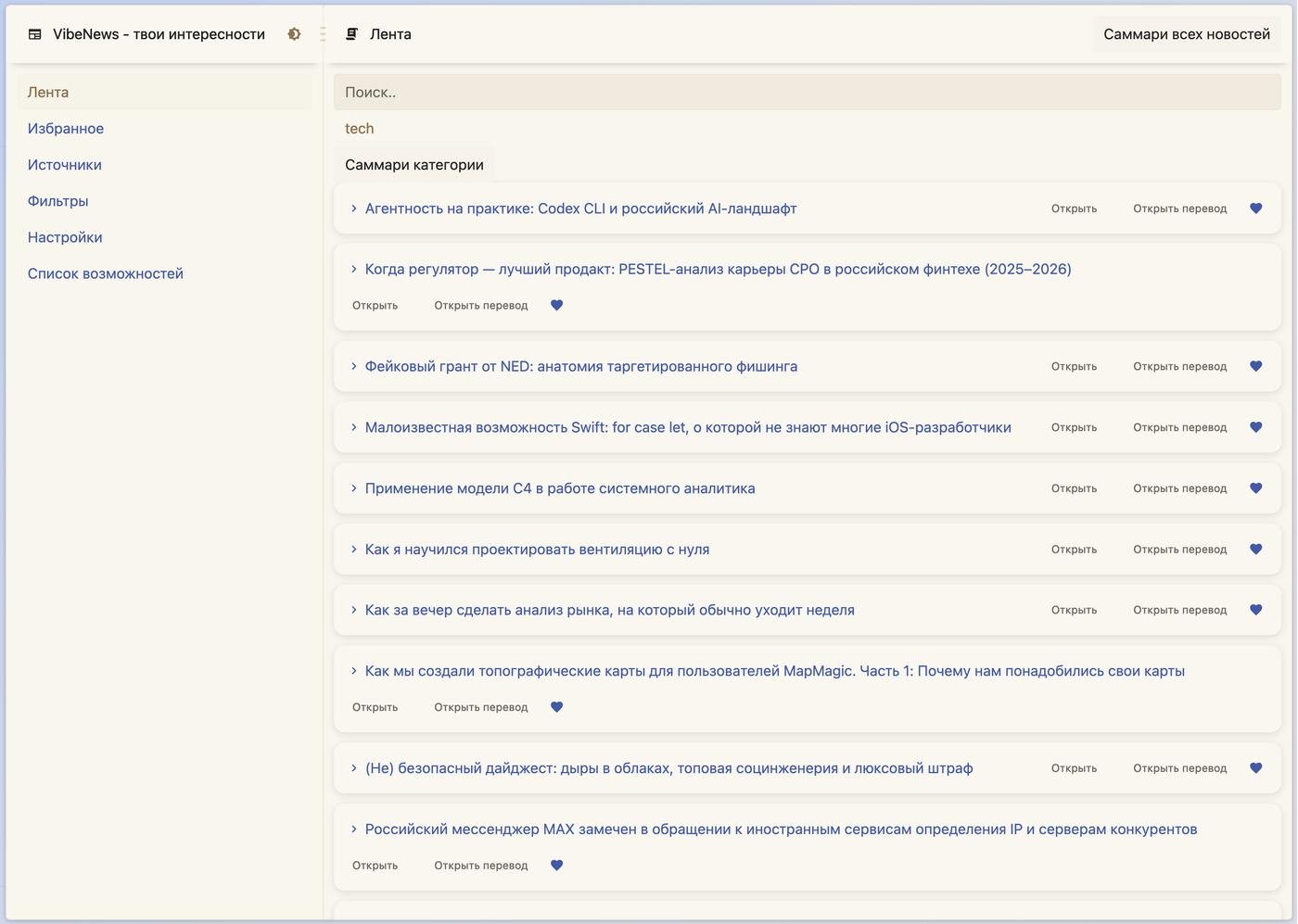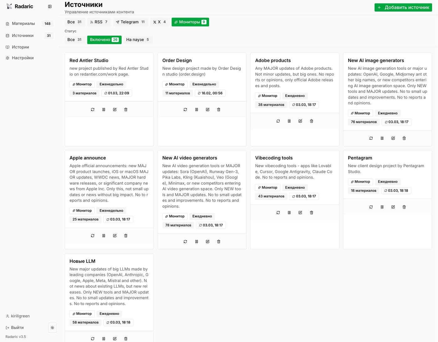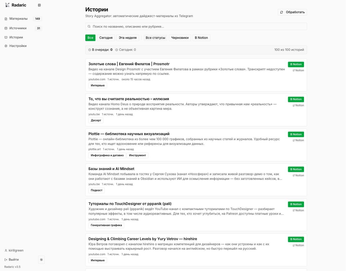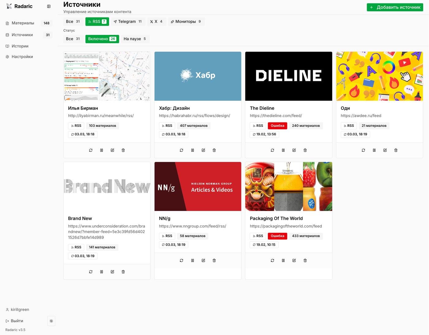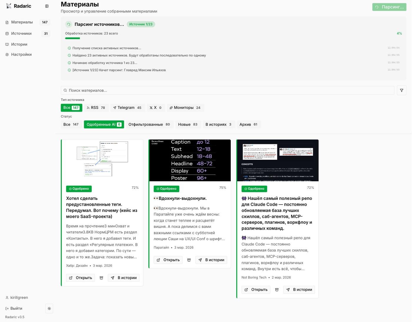 Я решил сделать для себя систему, которая автоматически отфильтровывает то, что мне заранее не интересно. Я добавляю в систему источники (RSS, TG-каналы, Твиттеры) и прописываю, что мне в нем нужно, а что мне в нем не нужно.