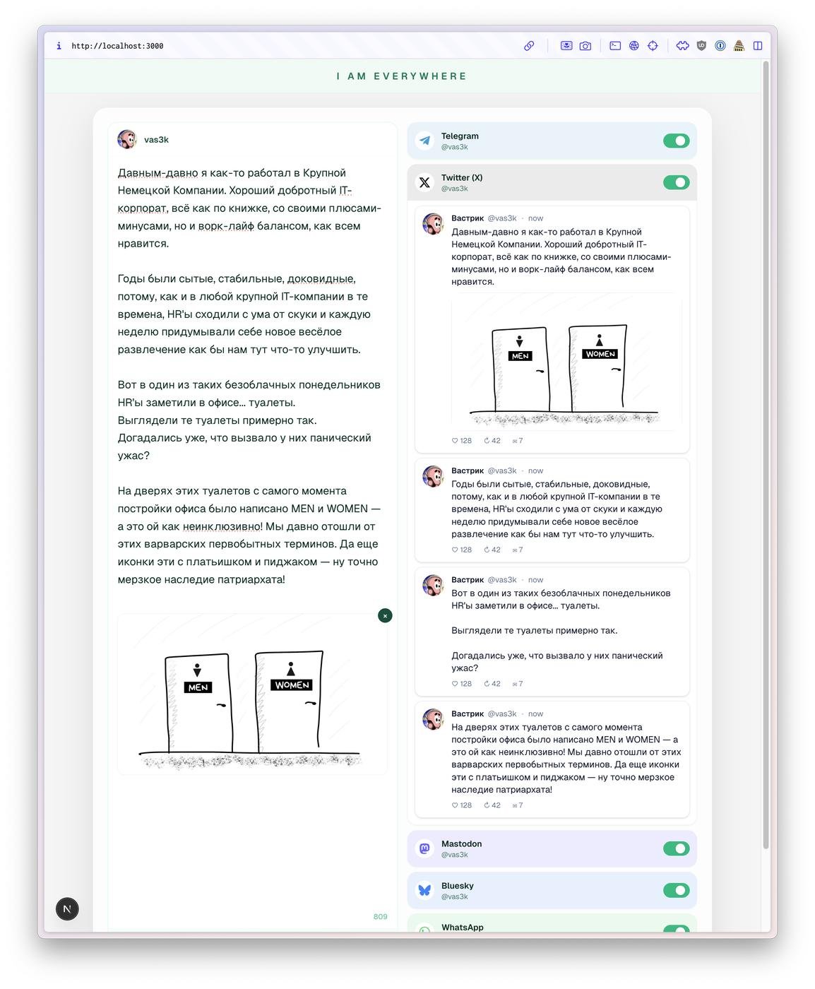 Название: I am Everywhere (это рабочее название, еще были: WriteOnly, PostEverywhere)
