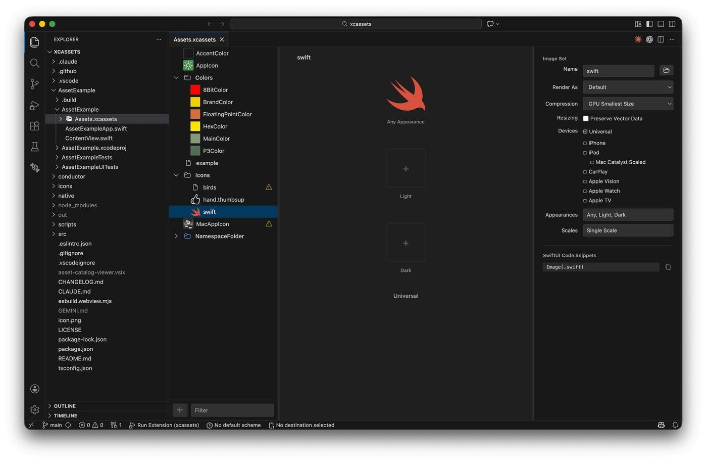 В чем идея и какую проблему решает: многие iOS-разработчики переезжают на VS Code/Cursor. Но там не очень удобно работать с ассетами iOS/macOS приложений. Cделал экстеншн, который повторяет функционал из Xcode, можно смотреть иконку приложения, иконки из бандла, даже есть превью для Lottie анимаций.