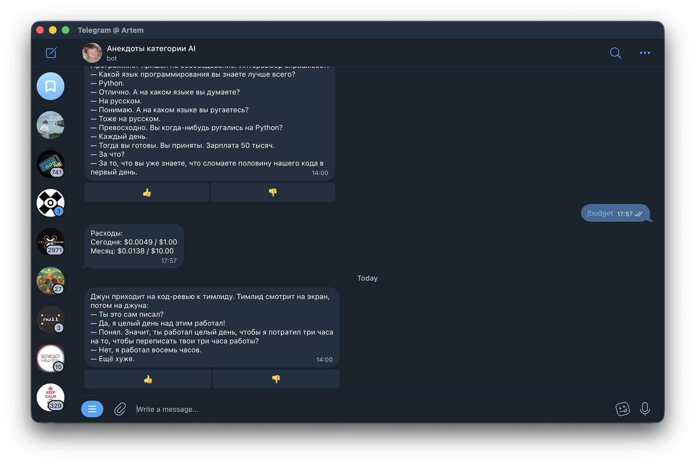 В чем идея и какую проблему решает: Телеграм бот, который генерирует анекдоты на заданную тему. Можно добавить в группу, тегать в сообщениях с темой или реплаить сообщения. Можно настроить отправку анекдота на каждый день по расписанию.