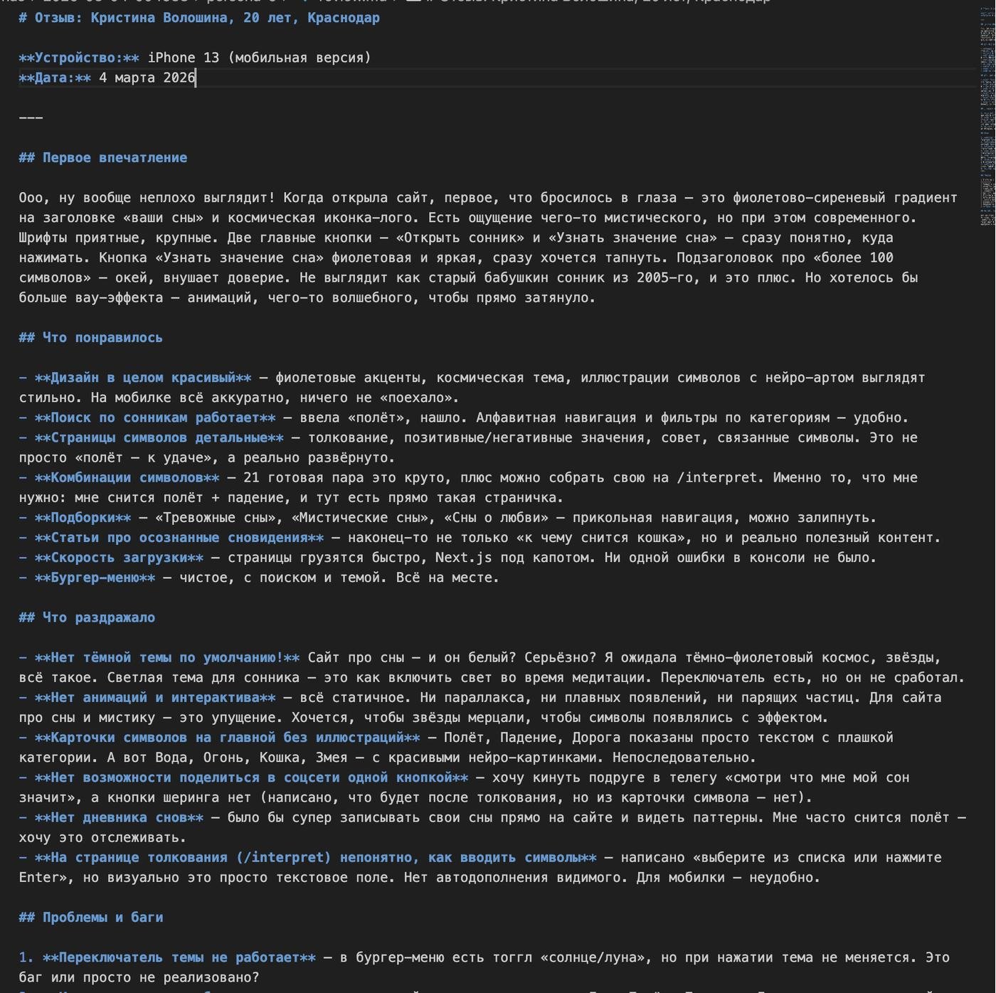 пенсионерокпользователей, которые при помощи playwright сэмитируют взаимодействие с сайтом со стороны своего (выдуманного) жизненного опыта и предоставят мне подробный отчет от каждого и общий отчет с итогами.Например, недавно запустил сайт с толкования снов (это из категории "запрос популярный, чобы нет")) и постоянно созываю этот консилиум чтобы он генерил мне репорты, по итогам которых я (другой Клод в соседнем терминале, хехе) исправляю найденные косяки.