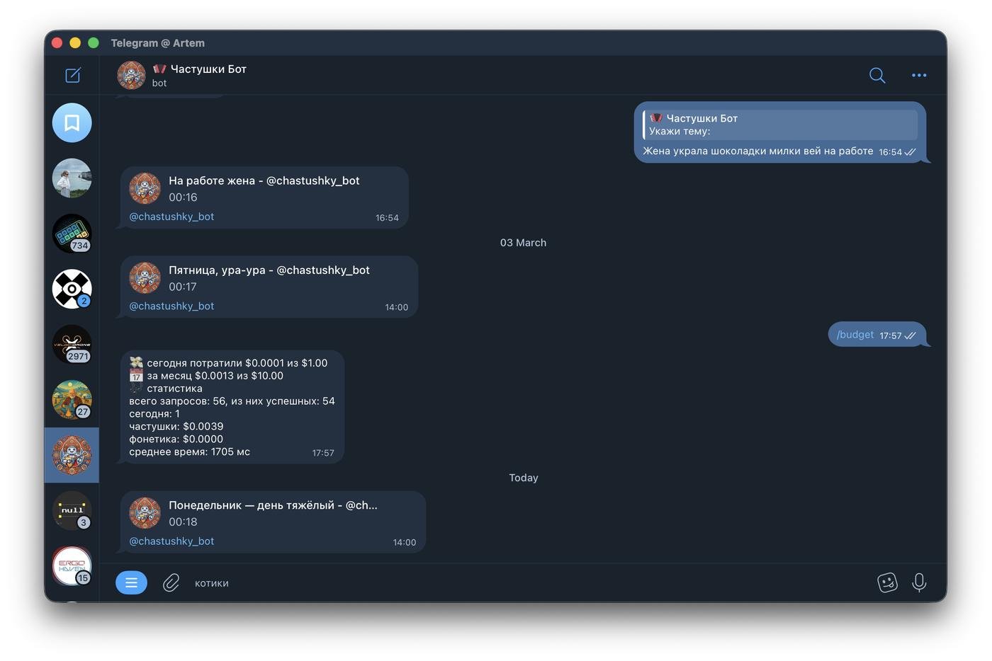 В чем идея и какую проблему решает: когда-то давно в телеграме был бот для генерации аудио по тексту частушки, сейчас он не работает. Я доработал идею, моему боту можно прислать тему и AI сгенерирует частушку. А ещё можно попросить присылать частушку на рандомную тему каждый день