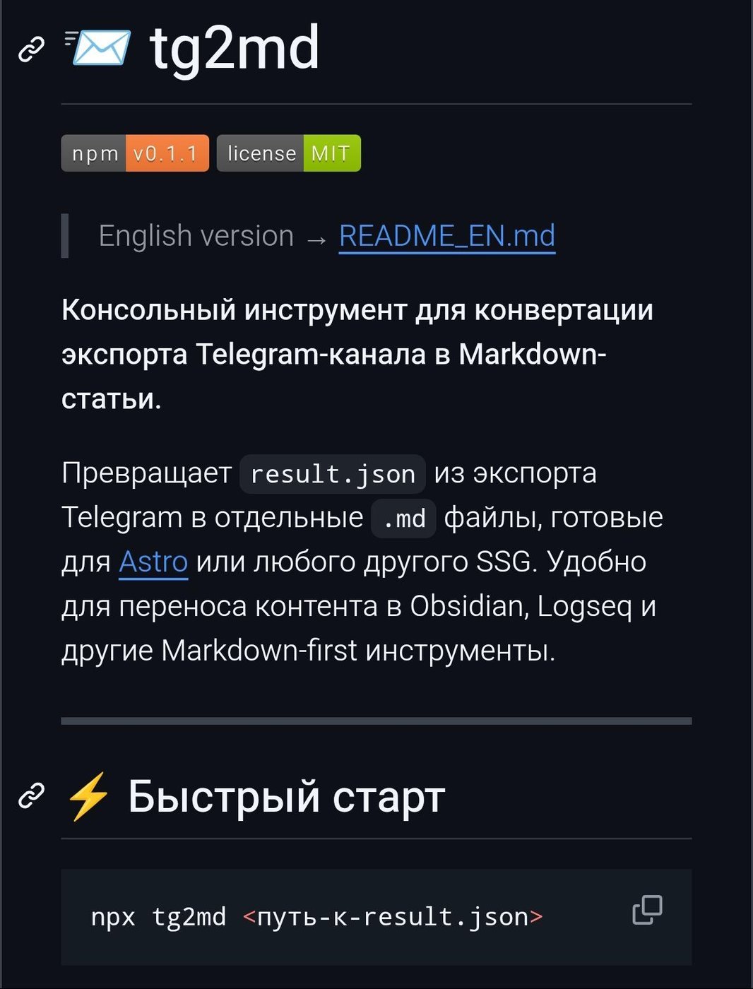 Превращает экспорт из телеграма в отдельные md файлы. Затем их можно закинуть в llm, положить в обсидиан, сгенерить сайт через Astro и вообще можно делать всё что душа пожелает.