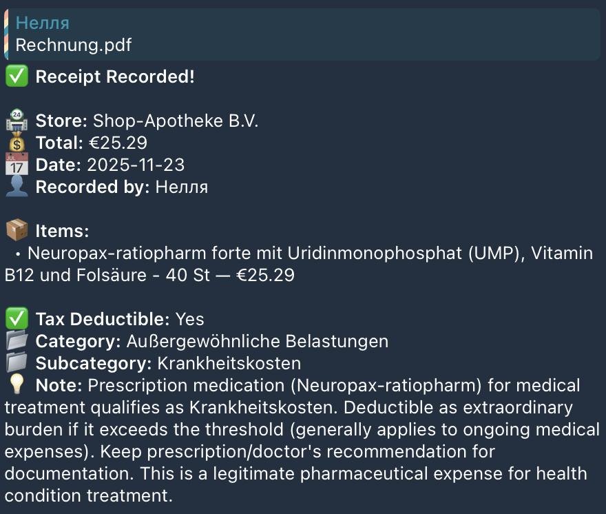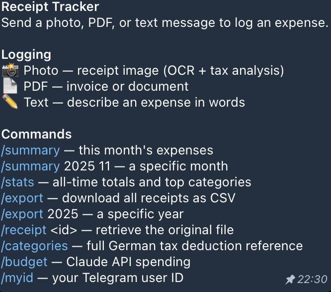 Теперь можно пдфки и фотки чеков кидать в группу, в которой есть бот. Файлы парсятся ocr и текст оттуда отправляется Клоду (пользуюсь хайку, дешево и сердито). Подходит для того, чтобы трекать всякие абсолютно дефолтные вещи, — отправляет напоминалку каждую неделю с популярными для вычета категориями, присылает один отчет для финансовой аналитики, хранит наши чеки на сервере.