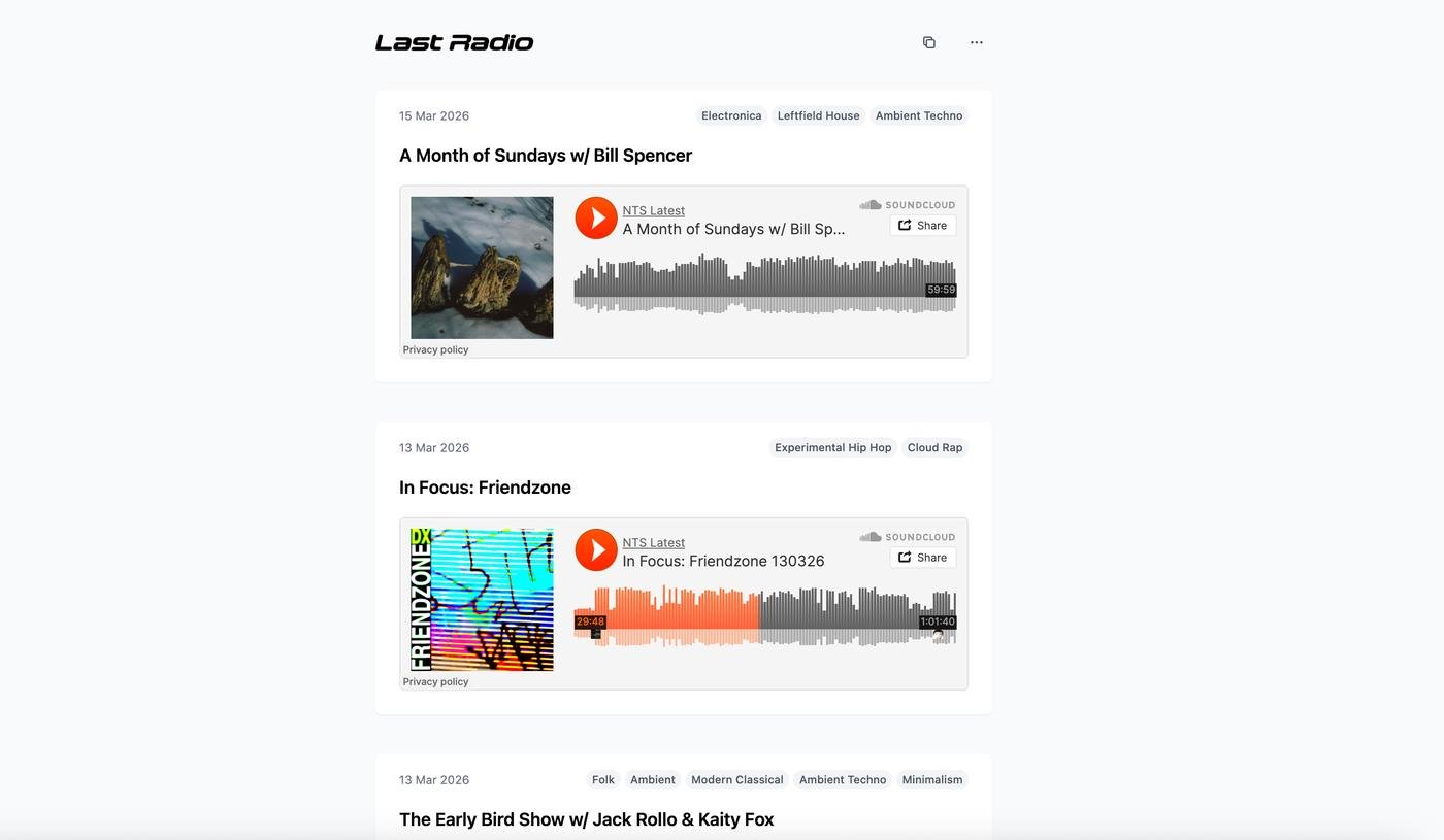 Хронологическая лента эпизодов и радио-шоу NTS.Radio с возможность фолловить отдельных музыкантов.