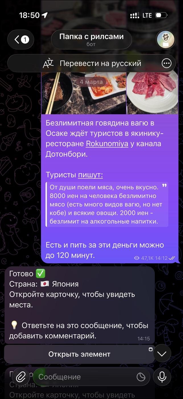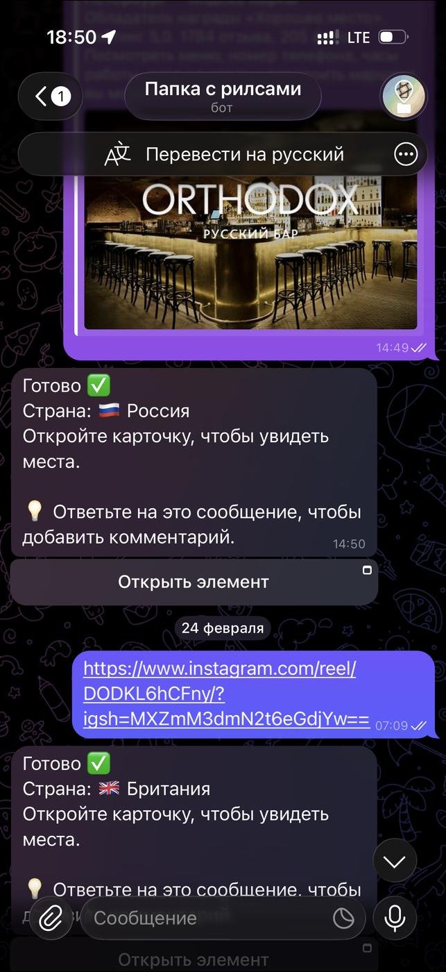В чем идея и какую проблему решает: бот в телеге, чтобы кидать рилсы в формате видео в два клика. Буквально. Ставим собачку, нажимаем таб, вставляем ссылку, тыкаем в появившееся.
