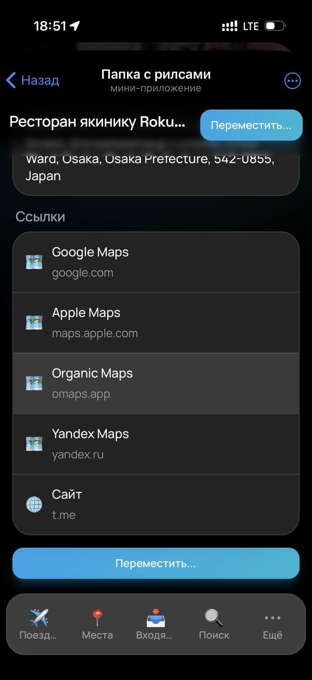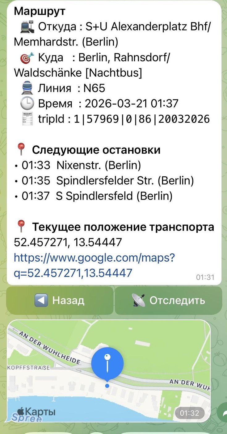 Также есть кнопочка "Отследить" которая в течение минутки будет ходить на API опрашивать обновления. Если транспорт отдаст новые координаты - то удалит старое сообщение с картой и зашлет новое