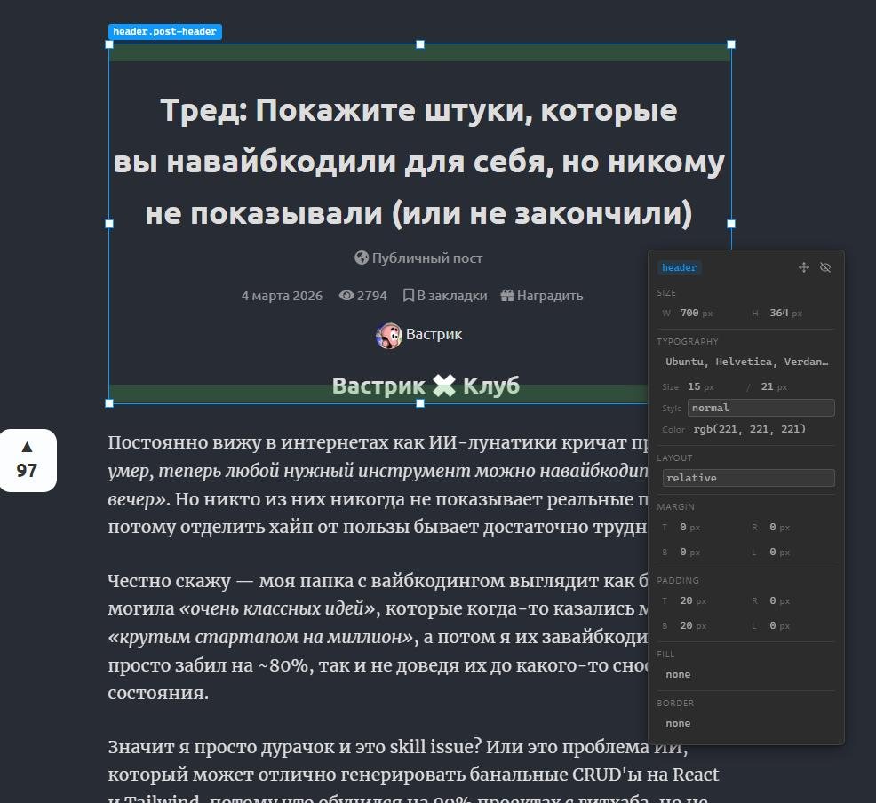 Честно скажу — моя папка с вайбкодингом выглядит как братская могила «очень классных идей», которые когда-то казались мне «крутым стартапом на миллион», а потом я их завайбкодил и... просто забил на ~80%, так и не доведя их до какого-то сносного состояния.
