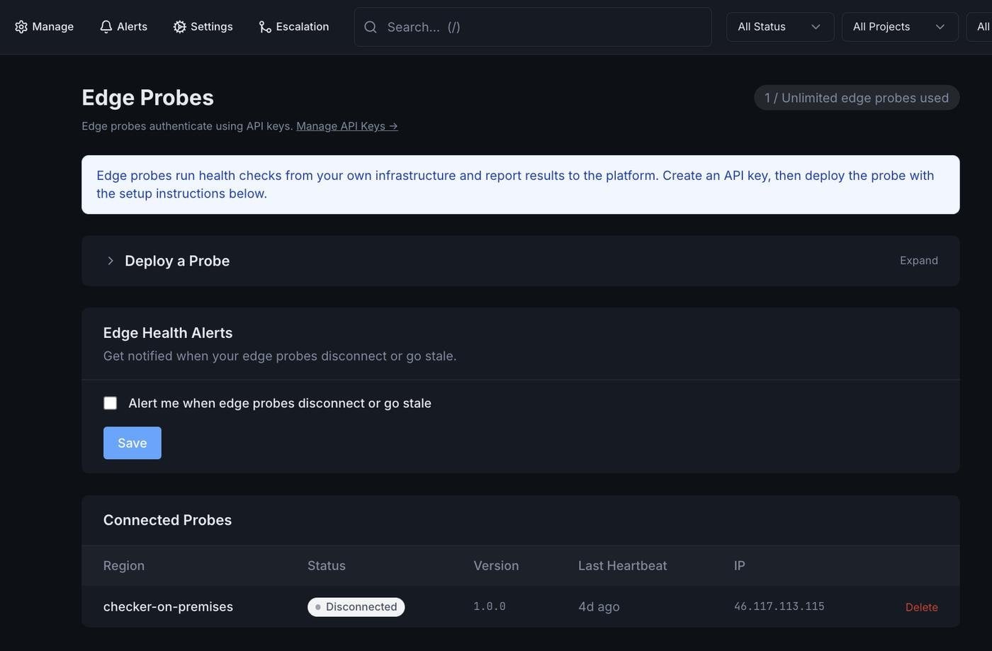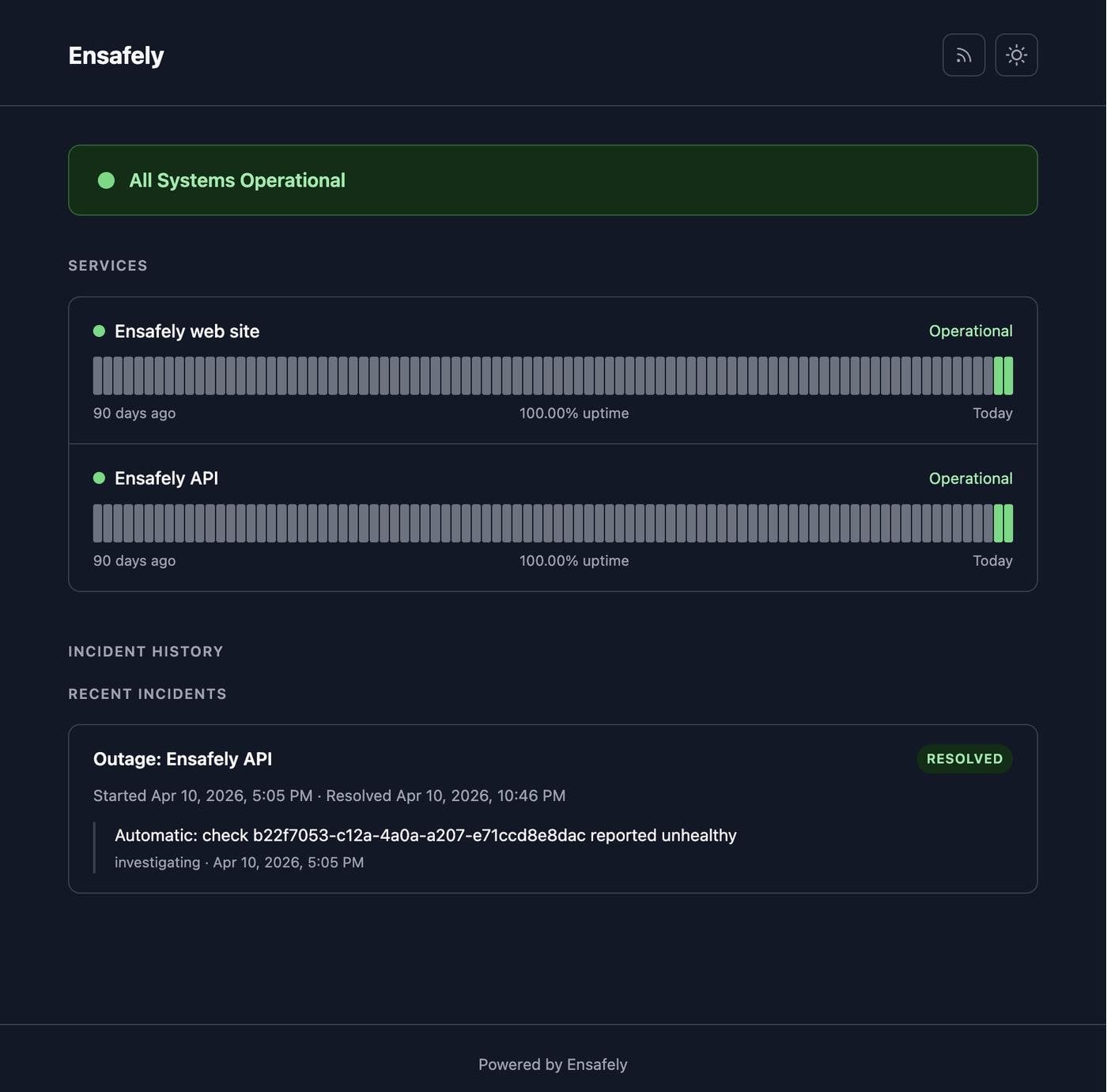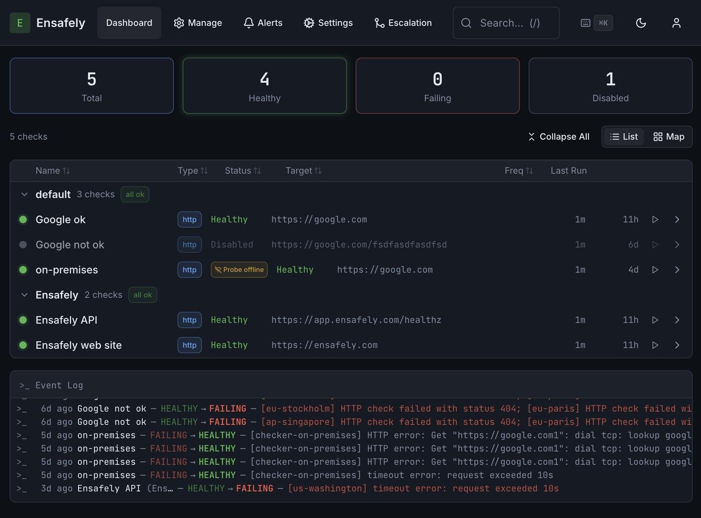 При желании checker подключается к Ensafely SaaS и получает улучшенное управление через веб-интерфейс (не все саас фичи есть в стендэлон бинаре), командную работу, статус-страницы и т.д.