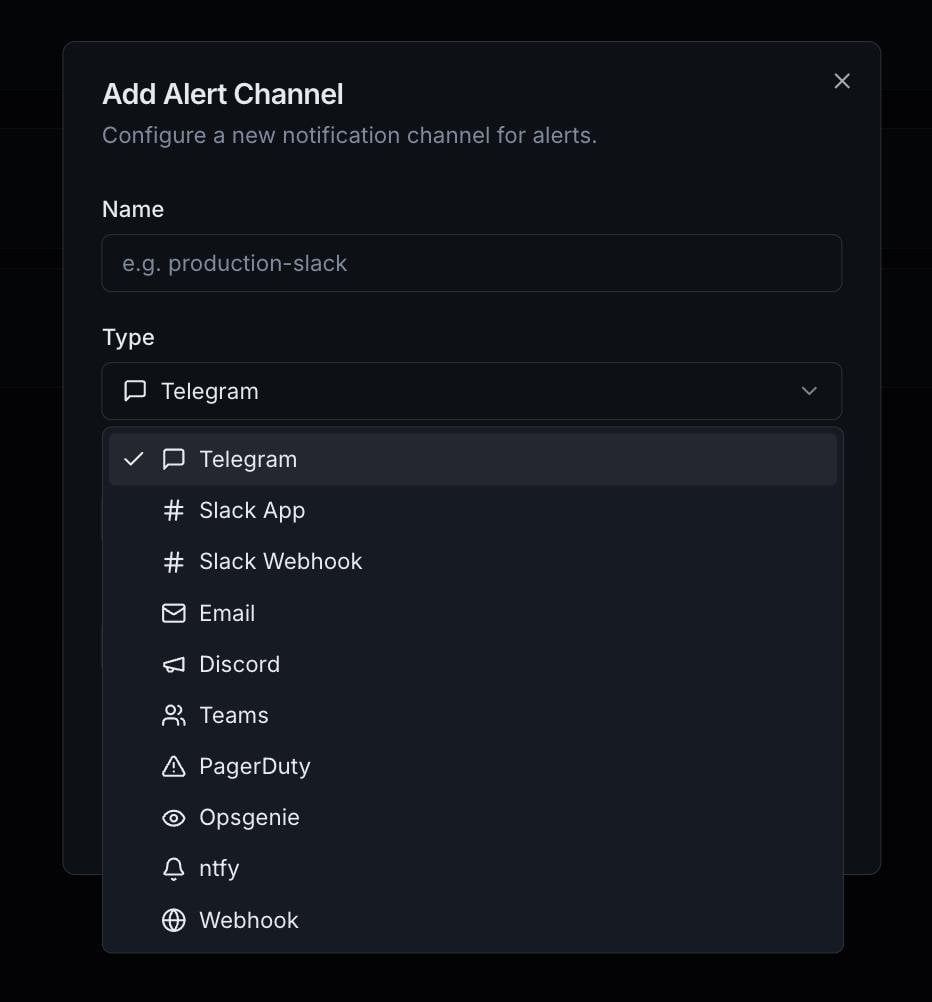 Много каналов алертов — Slack, Discord, Telegram (полноценные App-интеграции с кнопками), Email, PagerDuty, OpsGenie, MS Teams, ntfy, Webhooks. Можно сочетать в любые комбинации
